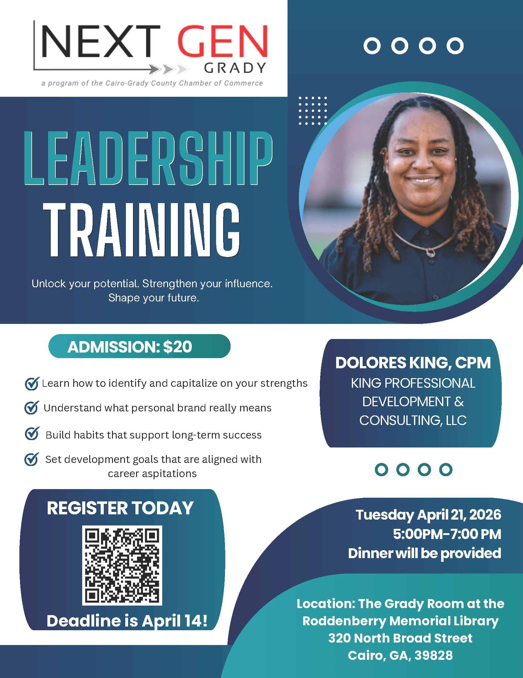 Join NextGen Grady for an engaging evening of leadership development designed to help you grow both personally and professionally! This dynamic training will focus on building your personal brand, strengthening your influence, and setting meaningful goals for long-term success.